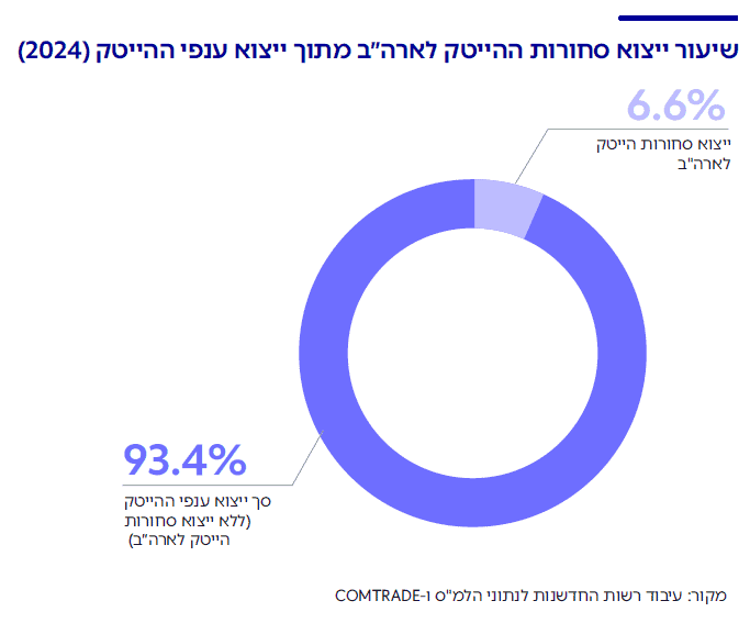 מהניתוח עולה כי סך ייצוא סחורות ההייטק לארה"ב עמד על כ-5 מיליארד דולר ב-2024 – כרבע מסך כלל ייצוא סחורות ההייטק מישראל.