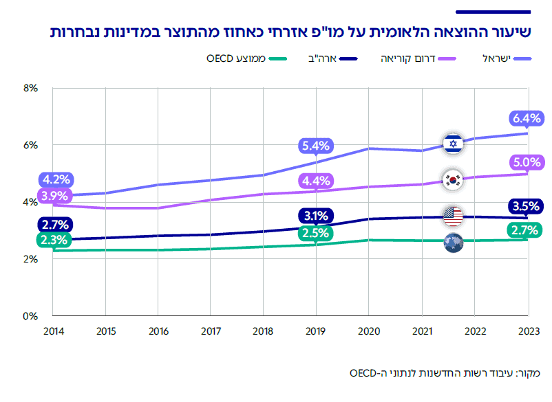 ישראל ממשיכה להוביל ברמה עולמית בהוצאה הלאומית על מחקר ופיתוח. ב-2023 – השנה האחרונה לגביה קיימים נתונים בהשוואה בין-לאומית – שיעור ההוצאה הלאומית על מו"פ אזרחי כאחוז מהתוצר היה 6.35%.4נתון זה כולל השקעה פרטית בסטארטאפים שיעור זה עלה מרמה של 4.2% ב-2014. לאורך התקופה, נתון זה הציג צמיחה הדרגתית.