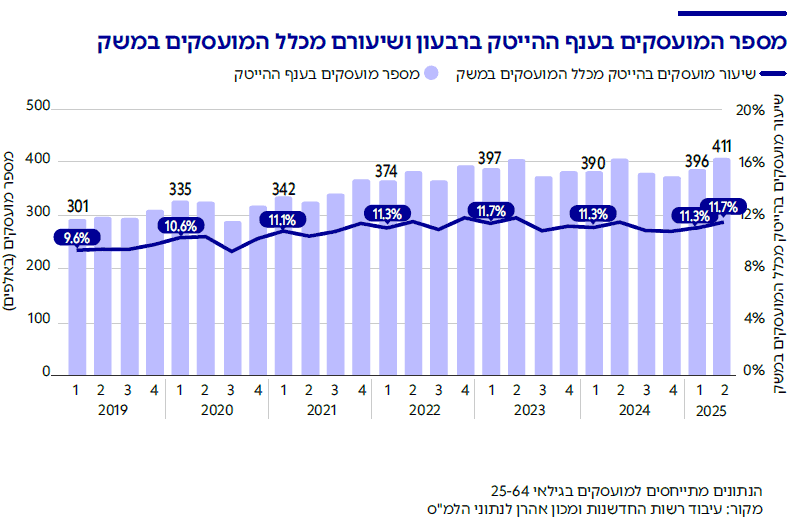גם ב-2025 ממשיכה מגמת הסטגנציה (קיפאון) בשיעור התעסוקה בהיייטק – זו השנה השלישית. נכון למחצית הראשונה של השנה, שיעור התעסוקה בהייטק מסך המועסקים במשק עומד על 11.5% לעומת 11.3% ב-2024 ו-11.6% ב-2023.
