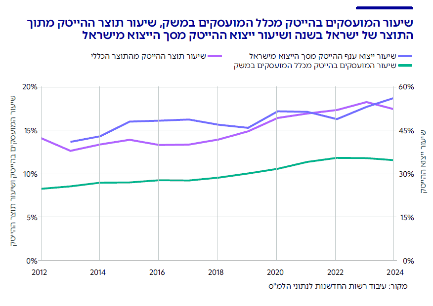 בנוסף, יש מתאם גבוה של כ-0.79 בין שיעור ייצוא ההייטק מכלל הייצוא מהמדינה לשיעור תוצר ההייטק,7מתאם זה הוא אומנם גבוה אך לא מושלם. לראיה, ב-2024 קיימת מגמה הפוכה בין המדדים כאשר שיעור תוצר ההייטק מסך התוצר ירד ואילו שיעור ייצוא ענף ההייטק מסך הייצוא עלה ושל כ-0.78 בין שיעור ייצוא ההייטק ושיעור המועסקים בהייטק מכלל המועסקים במשק. כלומר, גם ייצוא הענף מתואם עם התעסוקה בו.