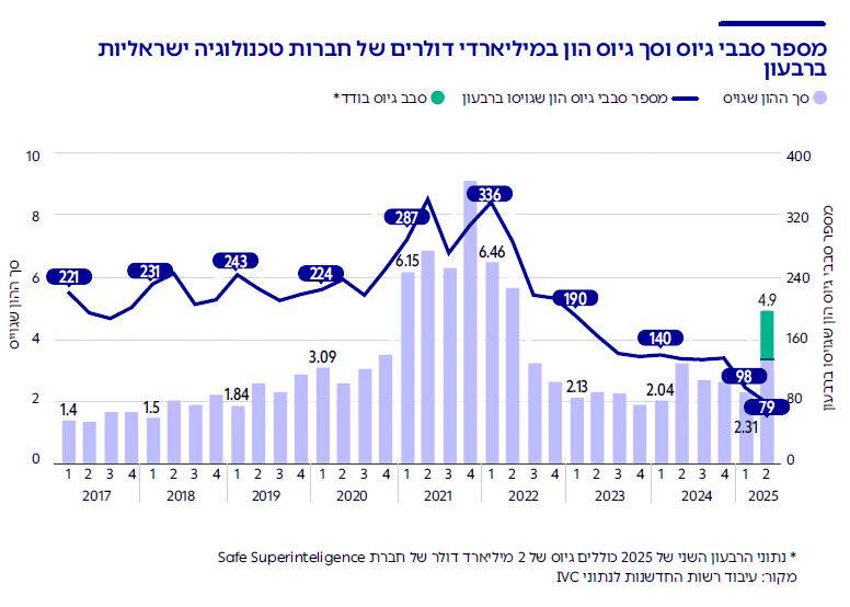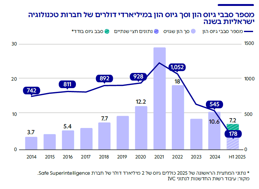 נכון למחצית הראשונה של 2025, חברות הייטק ישראליות גייסו 7.2 מיליארד דולר. כלומר, במחצית השנה גייסו קרוב ל-70% מכלל ההון שגויס בשנה הקודמת כולה. עם זאת, הנתונים כוללים גיוס ענק של חברת Safe Superintelligence , שבין מייסדיה יזמים ישראלים ולה מרכז פיתוח בישראל, בסך של 2 מיליארד דולר באפריל 2025. בניכוי גיוס ענק זה, נתוני המחצית הראשונה של 2025 מציגים קצב גיוס דומה ל-2024.