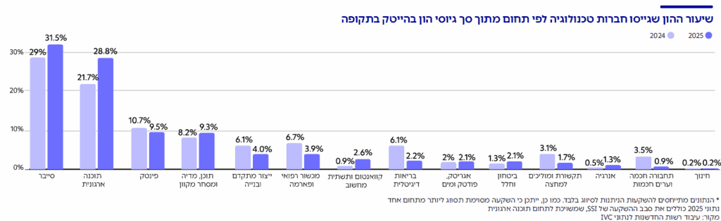 תחום מרכזי נוסף, שמשך כ-22% מההשקעות ב-2024 וכ-29% מההשקעות במחצית הראשונה של 2025, הוא תוכנה ארגונית. כ-60% מההון שהושקע בהייטק הישראלי ב-2025 היה בחברות סייבר או תוכנה ארגונית. יתר התחומים מרכזים שיעור נמוך משמעותית מההשקעות.