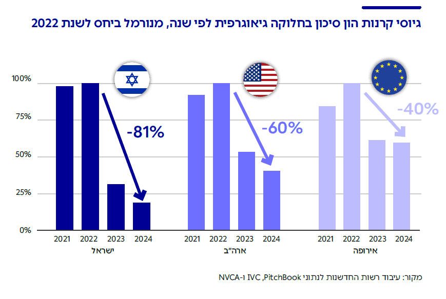 הירידה בגיוסי קרנות הון הסיכון הישראליות אינה תופעה ייחודית, וניתן לזהות מגמה דומה מאז 2022 גם בקרנות בארצות הברית ובאירופה. יחד עם זאת, הירידה בישראל חדה יותר בהשוואה העולמית: בארצות הברית גייסו קרנות הון סיכון כ-189 מיליארד דולר ב-2022 וכ-77 מיליארד ב- 2024 – ירידה של כ-60%. באירופה הירידה הייתה מתונה יותר בתקופה זו ועמדה על כ-40%. ואילו בישראל הירידה הייתה חדה משמעותית ועמדה על כ-81% בין השנים 2022 ל-2024 בסך ההון שגויס.