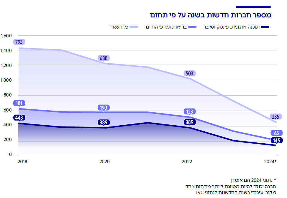 בניתוח של חברות לפי תחומים נראה כי יש עלייה בשנים האחרונות (2018-2024) בחלק היחסי בהקמת חברות חדשות בתחומי הסייבר, מכשור רפואי ואנרגיה (מתוך החברות שתחום פעילותן ידוע בשלב זה). לעומת זאת, בתחום התוכן והמדיה יש ירידה בחלק היחסי של החברות החדשות.