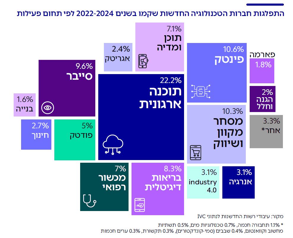 בהסתכלות על דור הסטארטאפים הבא של ישראל, עולה כי יותר ממחצית מחברות ההייטק שקמו בישראל בשלוש השנים האחרונות (2022-2024) פועלות באחד מארבעת התחומים הבאים: תוכנה ארגונית (22.2% מהחברות החדשות), פינטק ומסחר מקוון (כ-10% כל תחום) וסייבר (9.6%). כלומר, נראה כי ההייטק הישראלי ממשיך להתמקד בתחומים שנמצאים בראש החץ שלו בשנים האחרונות.