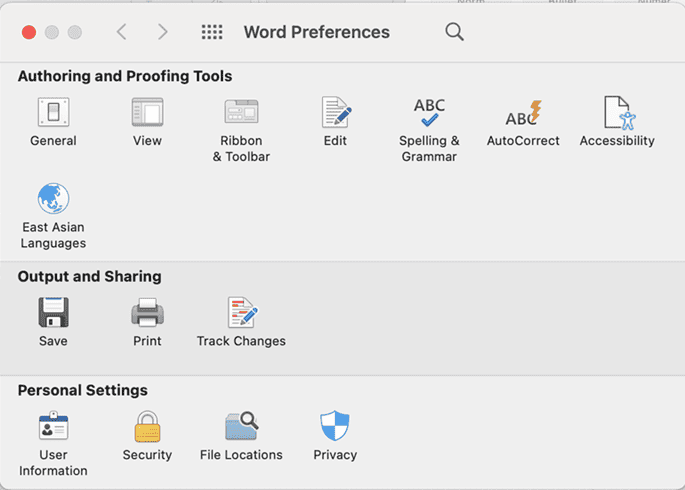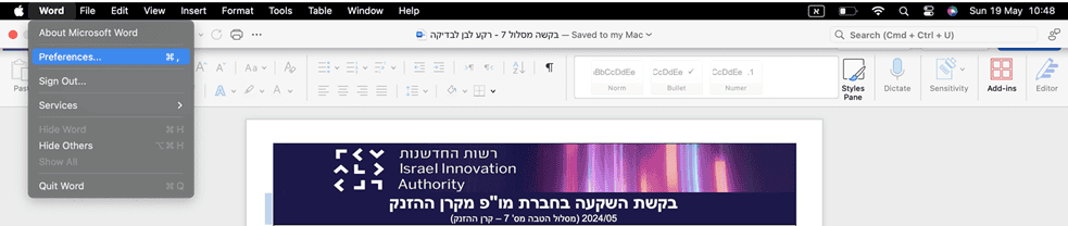 - יש ללחוץ על תפריט העליון בכותרת ‘word’ ולבחור בPreference (העדפות)